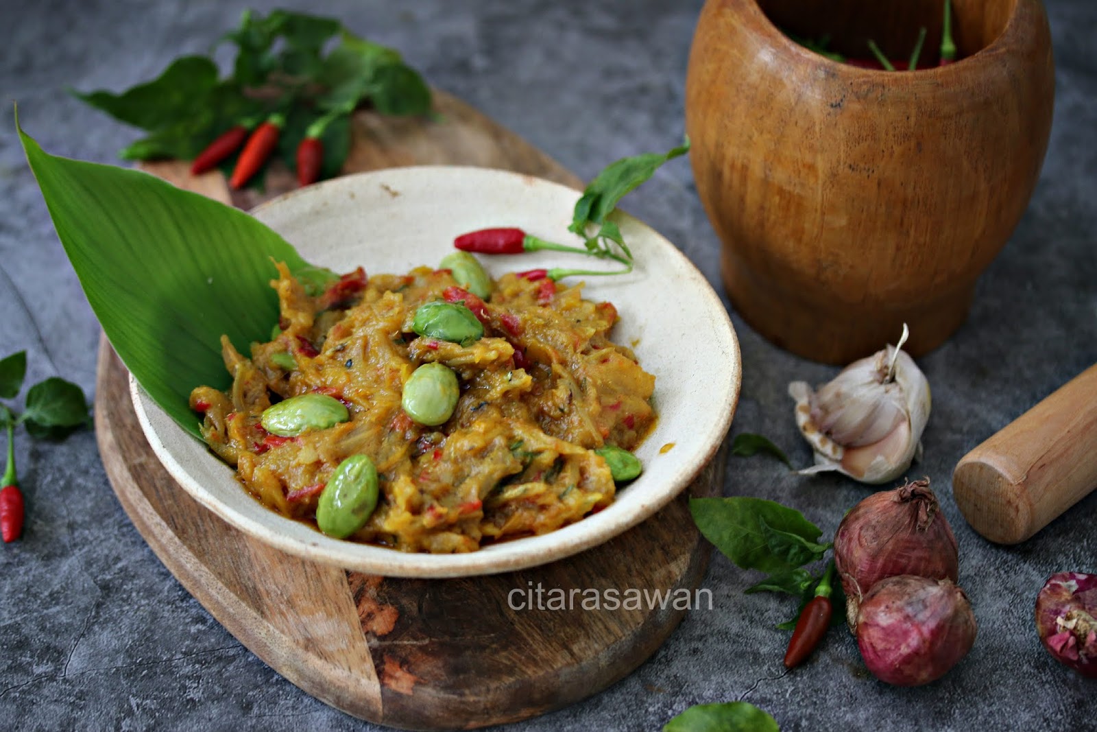 Tumbuk bawang putih, bawah merah dan cili padi.